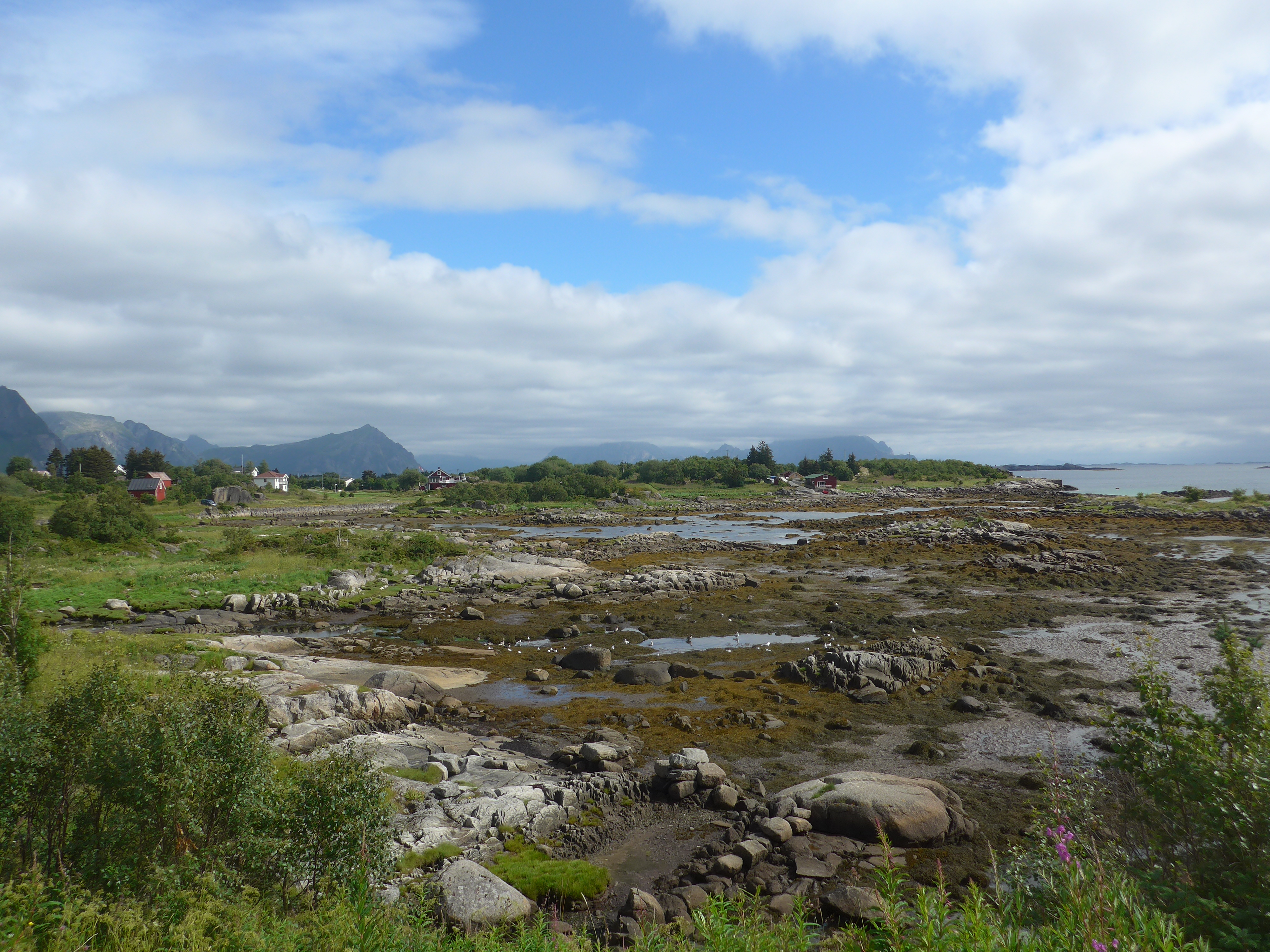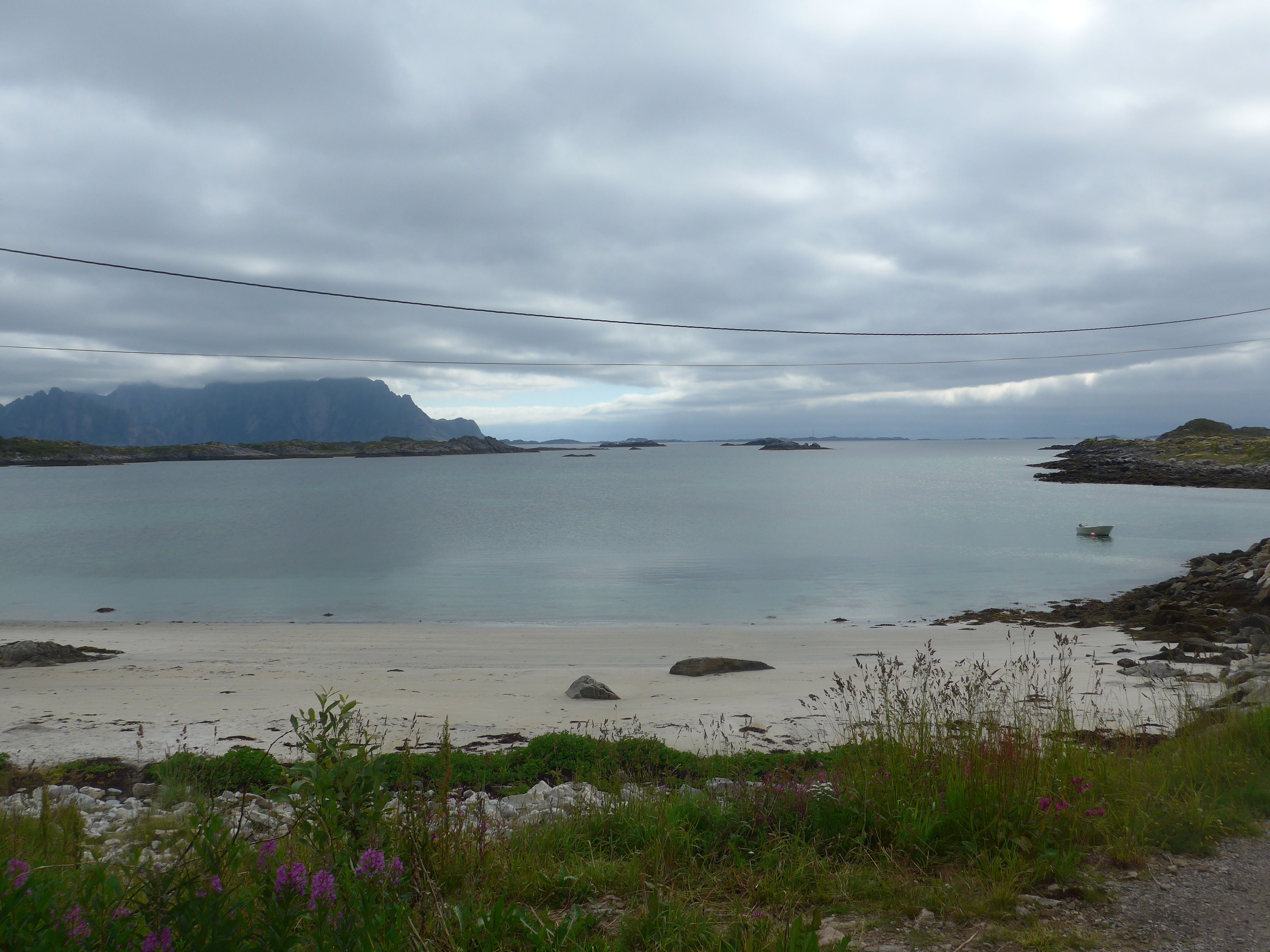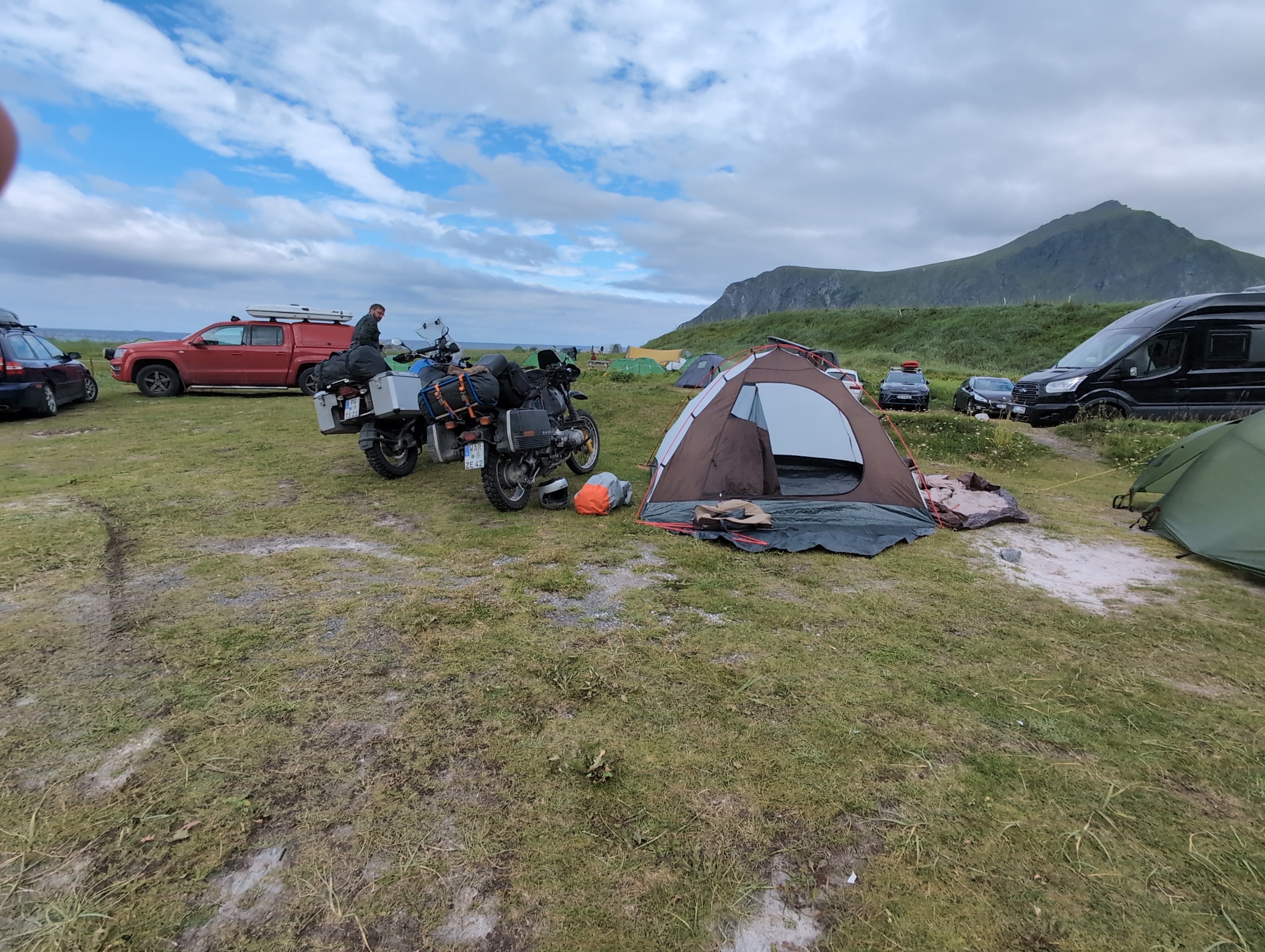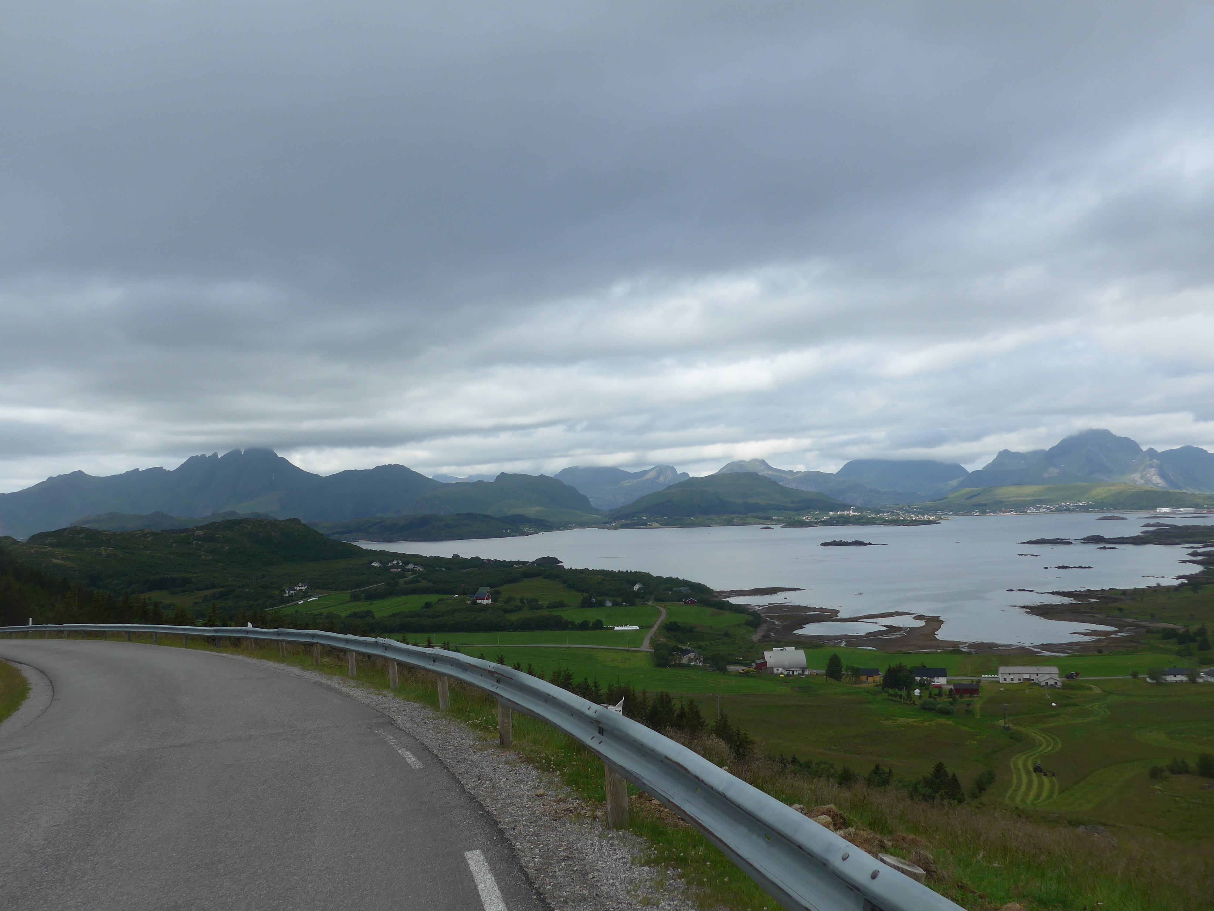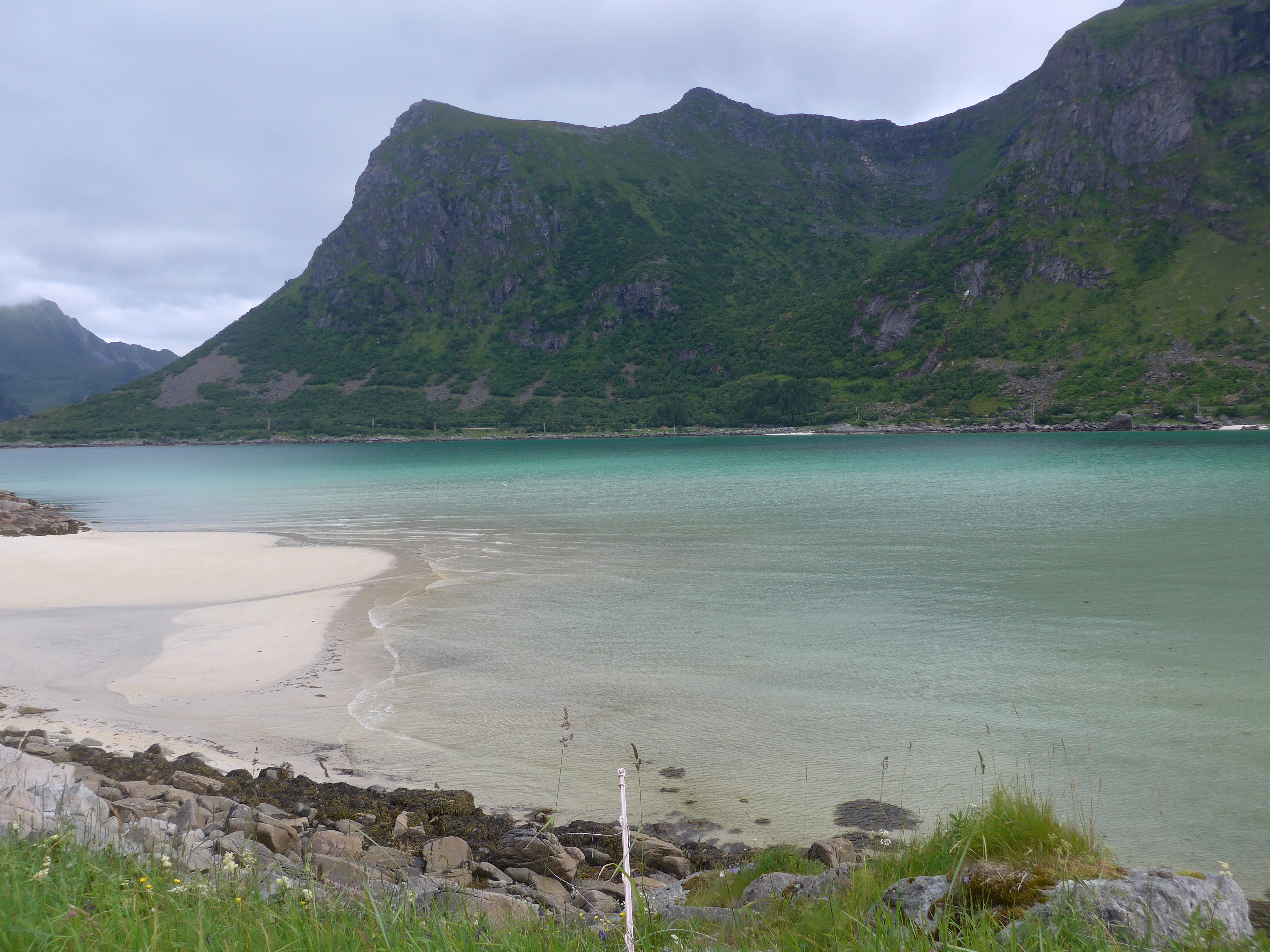 Es gibt einen Campingplatz Namens “Lofoten Beach Camp”. Das scheint genau die Richtige Location für unsere Bedürfnisse zu sein. Der Platz ist gute 100 km von unserer letzten Bleibe entfernt. Machbar. Unterwegs haben wir es ruhig angehen lassen. Die Lofoten sind echt der Hammer. Das Kristall klare Wasser hat eine Smaragd grün bis türkis wie in der Südsee. Dazu das Panorama mit den Bergen und kleinen Dörfern. Oder besser, vereinzelten Häusern. Fahren mach auch wieder riesigen Spass. Kurvige Straßen Berg auf, Berg ab und ab und an ein Tunnel oder eine Brücke. Es gibt sogar einspurige Brücken mit Ampel davor.
