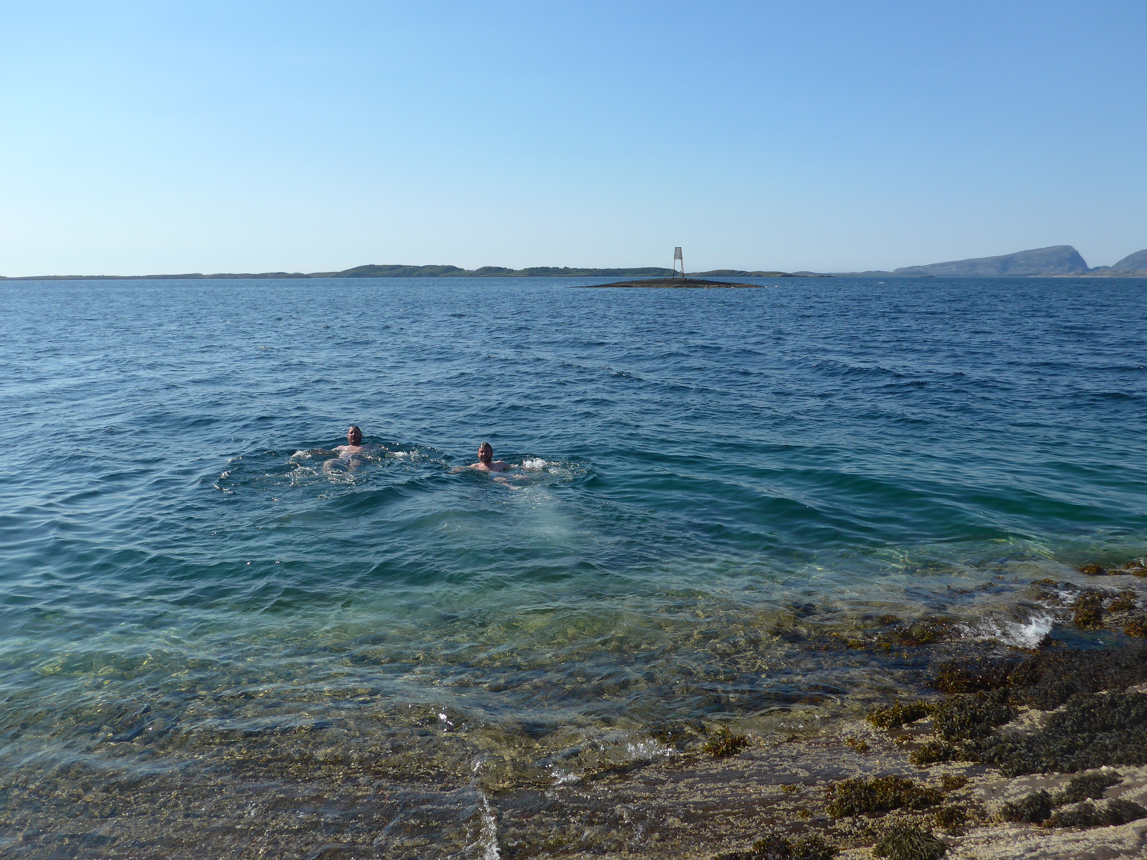 Wir haben bei ca. 24°C und schönstem Wetter den Tag hart entspannt. So gerade konnten wir uns noch auf unser Tagesziel, bei schönen Wetter im Nordmeer zu schwimmen, aufraffen.
