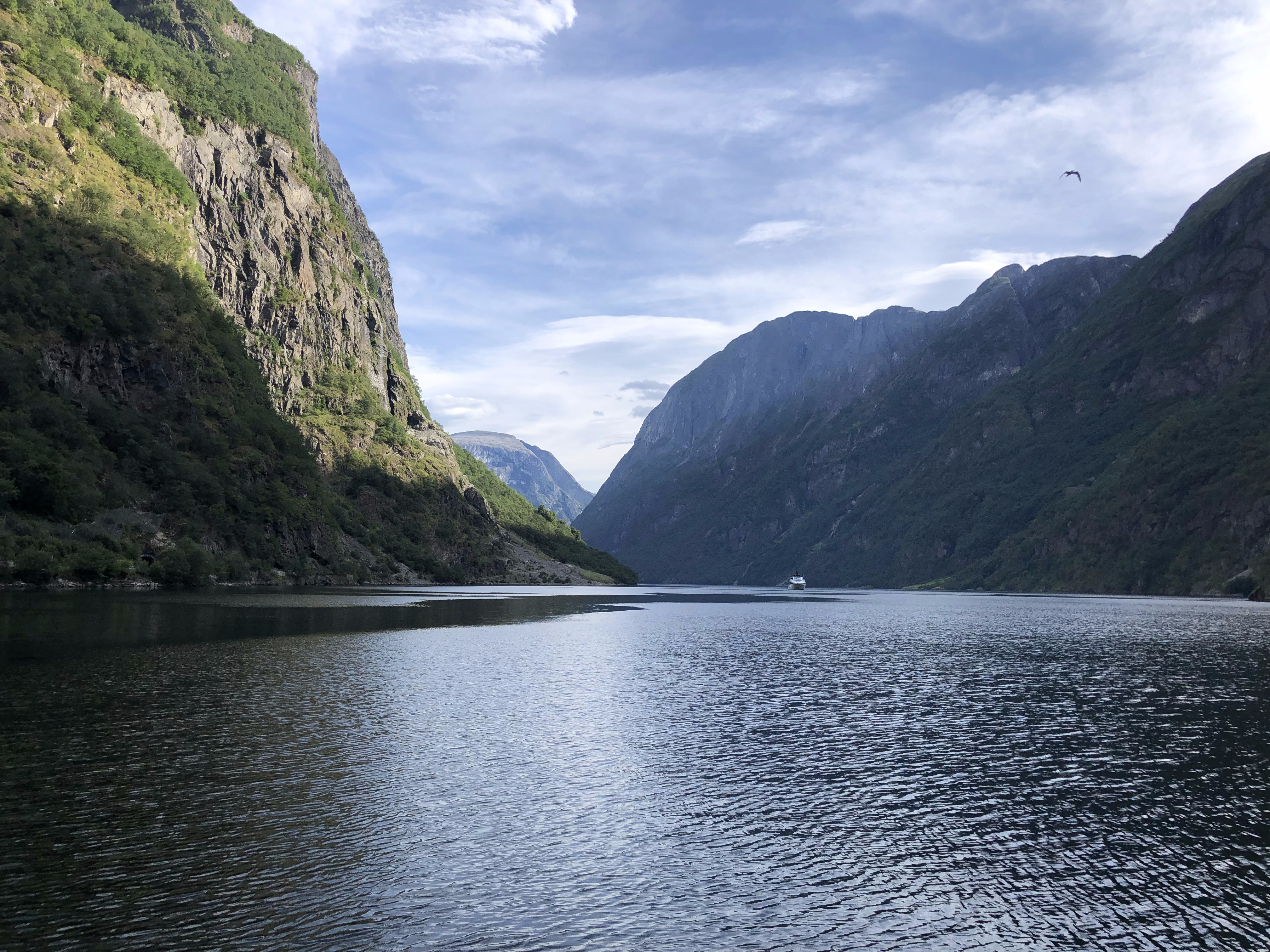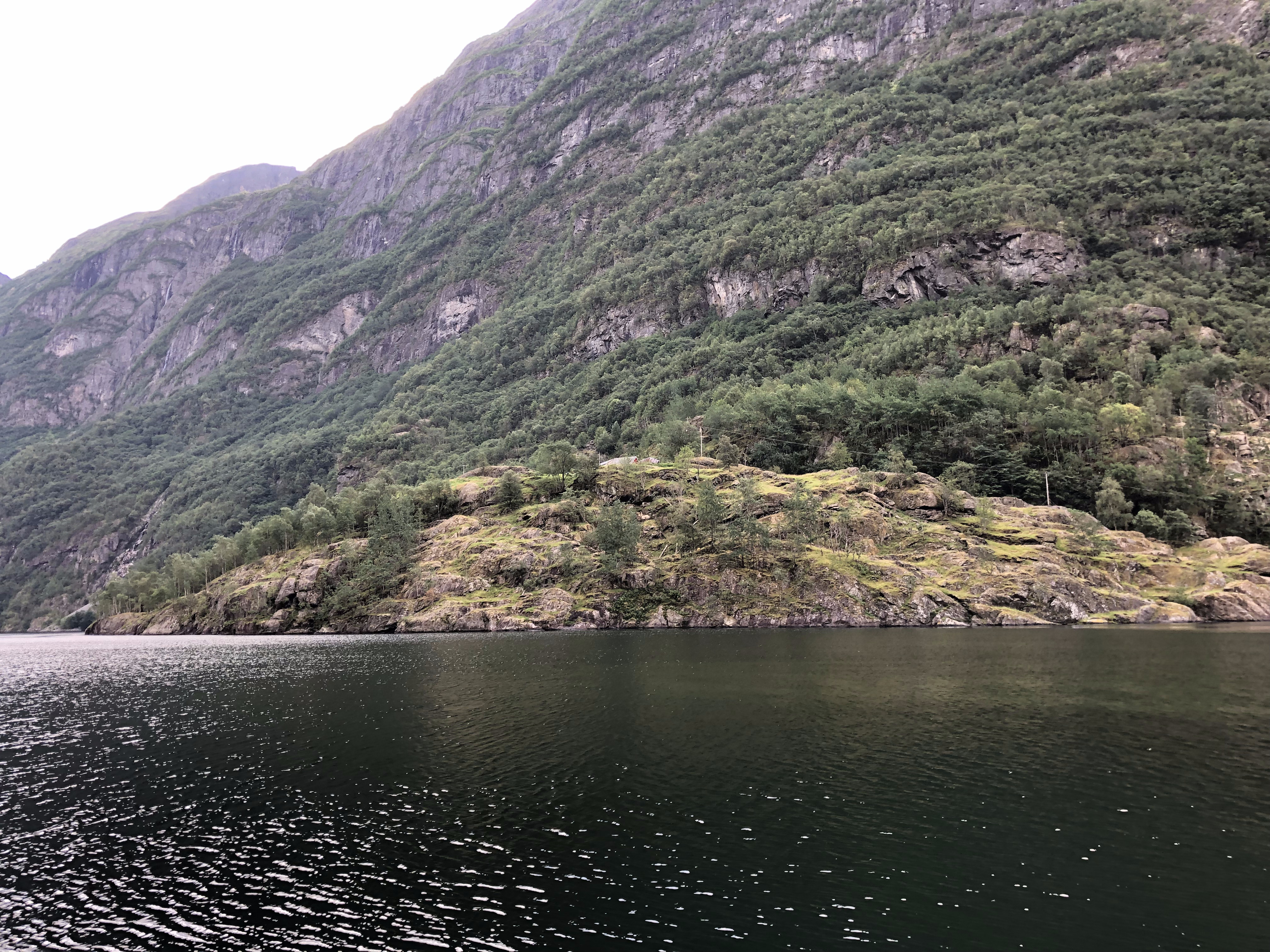 Eigentlich wollten wir morgens um 08:30 Uhr eine Bootsfahrt durch den Nærøyfjord nach Gudvangen am Ende des Fjords machen. Der Nærøyfjord gilt als der schmalste Fjord und ist ebenfalls ein Weltnaturerbe. Da die einfache Fahrt mindestens 2 Stunden dauert, wir ein bisschen spät dran waren, es gab nämlich Komplikationen in den sanitären Anlagen, haben wir uns entschlossen den Trip ausfallen zu lassen… Die nächste Tour ging erst wieder um 10:30 Uhr und Gudvangen liegt eh auf der Strecke zu unserem Etappenziel Bergen. Da halten wir da einfach mal geschwind.