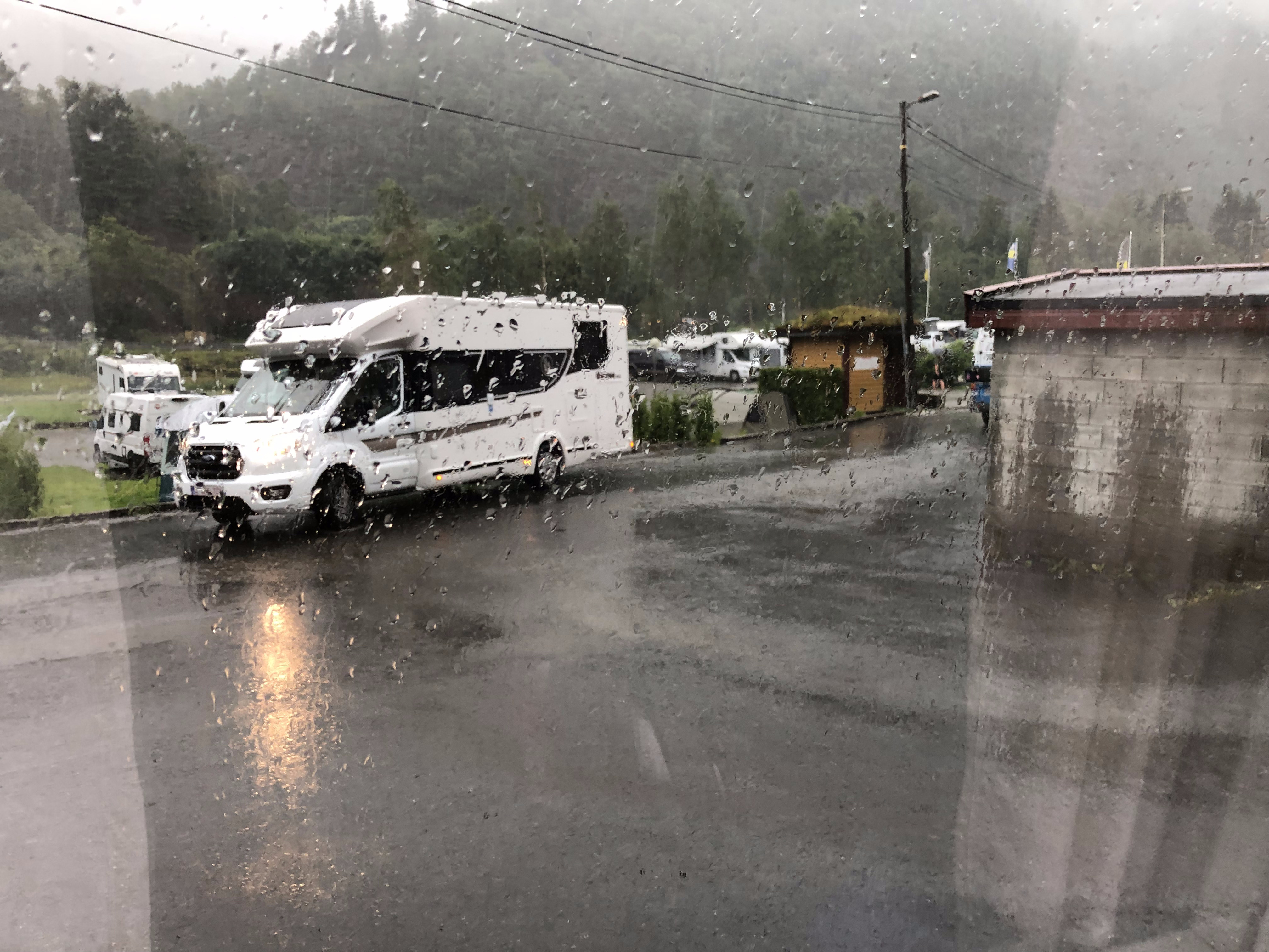 Die Fahrt ging durch unzählige Tunnel, an Fjorden vorbei, durch tiefe Schluchten, Berg auf und Berg ab. Recht gemächlich kamen wir Bergen näher. In einem Vorort haben wir unsere Bleibe, eine Hütte für zwei Nächte. Worauf wir aber nicht geachtet haben, hier ist der Hund verfrohren. Es gibt nichts, gar nichts. Weit und breit. Wir sind auf unsere Notrationen angewiesen. Wenigstens fing es am frühen Abend wirklich an zu gallern. Wie Sau. Es tut manchmal auch ganz gut zu sehen, die richtigen Entscheidung getroffen zu haben. Morgen schauen wir uns dann Bergen an, dann soll das Wetter wieder besser sein. So der Plan.
